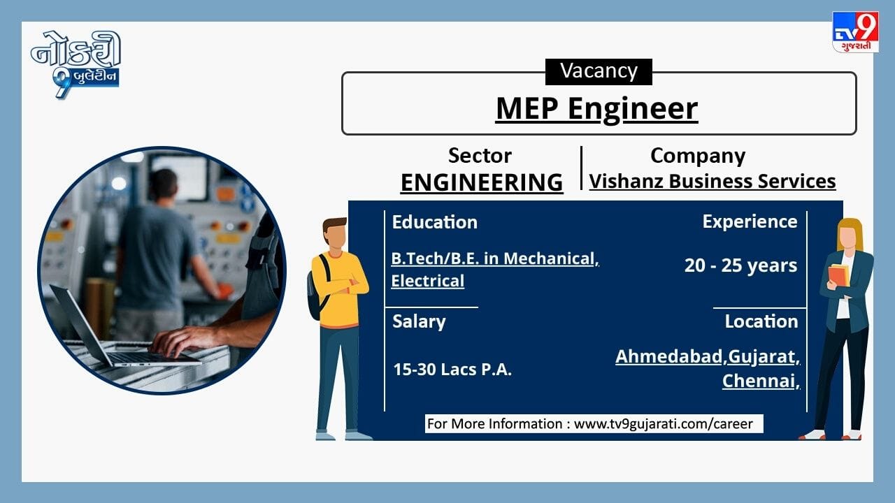 ધોરણ 10 કે 12 પાસ કે સ્નાતક થયેલા લોકો માટે નોકરીની ઉતમ તકો (Job Vacancy) સર્જાઈ છે, એન્જિનિયરિંગ ક્ષેત્રે નોકરી શોધી રહેલા ઉમેદવારો આ લીંક પર ક્લિક કરો. સ્નાતકોને મહિને 2,50,000થી વધુ પગાર મળશે.