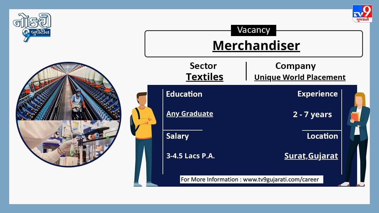 Ahmedabad: તમે નોકરીની શોધમાં છો અને તમને નોકરી શોધવામાં મુશ્કેલી પડે છે, તો તમે આ આર્ટિકલમા આપેલી ડિટેલ્સ વાંચીને જોબ માટે એપ્લાય કરી શકો છો. તમે ધોરણ 10 કે 12 પાસ છો કે સ્નાતક છો, તો અમે તમારા માટે અનેક ક્ષેત્રોમાં નોકરીની નવી તકો લઈને આવ્યા છીએ. ધોરણ 10 કે 12 પાસ કે સ્નાતક થયેલા લોકો માટે નોકરીની ઉતમ તકો (Job Vacancy) સર્જાઈ છે, ટેક્ષટાઈલ ક્ષેત્રે નોકરી શોધી રહેલા ઉમેદવારો આ લીંક પર ક્લિક કરો. સ્નાતકોને મહિને 62,000થી વધુ પગાર મળશે.