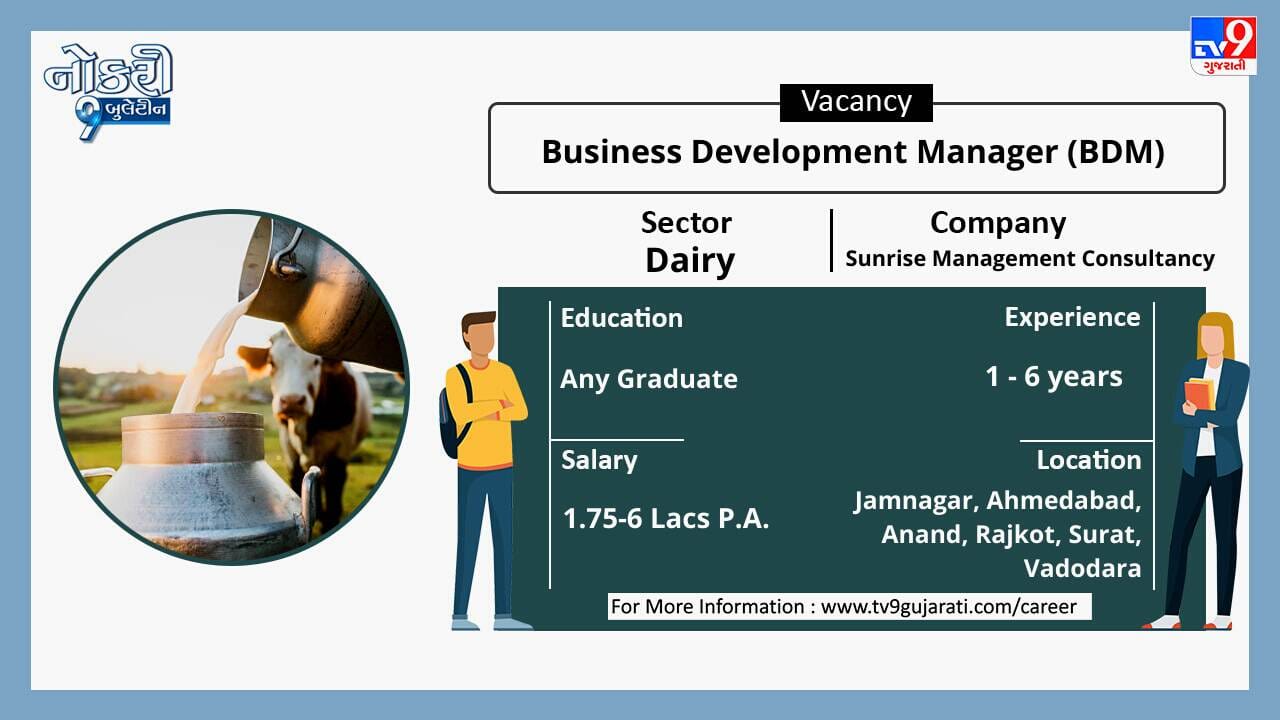 ધોરણ 10 કે 12 પાસ કે સ્નાતક થયેલા લોકો માટે નોકરીની નવી તકો સર્જાઈ છે, ડેરી ક્ષેત્રે નોકરી શોધી રહેલા ઉમેદવારો આ લીંક પર ક્લિક કરો. સ્નાતકોને મહિને 75,000થી વધુ પગાર મળશે.