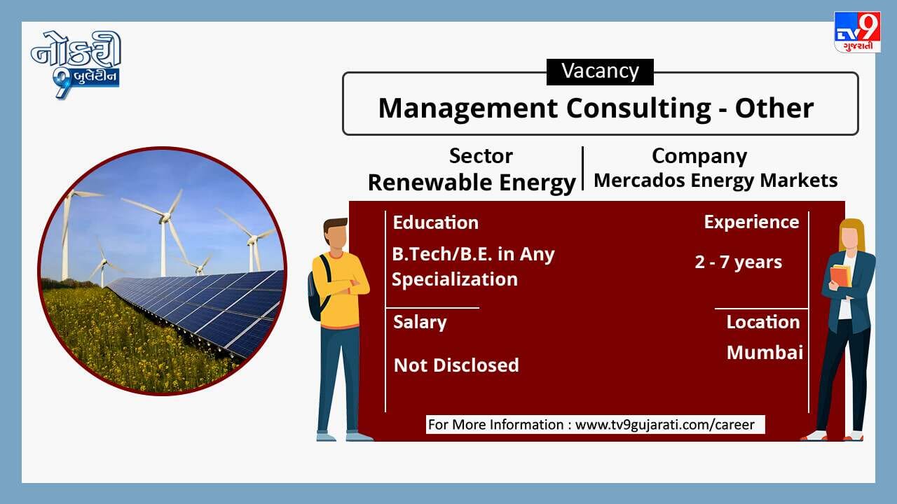 ધોરણ 10 કે 12 પાસ કે સ્નાતક થયેલા લોકો માટે નોકરીની ઉતમ તકો (Job Vacancy) સર્જાઈ છે, રિન્યુએબલ એનર્જી ક્ષેત્રે નોકરી શોધી રહેલા ઉમેદવારો આ લીંક પર ક્લિક કરો. સ્નાતકોને મહિને 1,00,000થી વધુ પગાર મળશે.