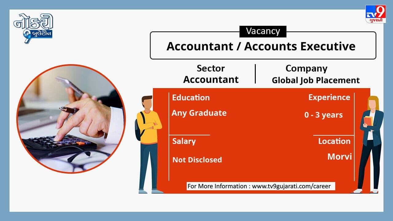 ધોરણ 10 કે 12 પાસ કે સ્નાતક થયેલા લોકો માટે નોકરીની ઉતમ તકો સર્જાઈ છે, એકાઉન્ટન્ટ ક્ષેત્રે નોકરી શોધી રહેલા ઉમેદવારો આ લીંક પર ક્લિક કરો. સ્નાતકોને મહિને 29,000 થી વધુ પગાર મળશે.