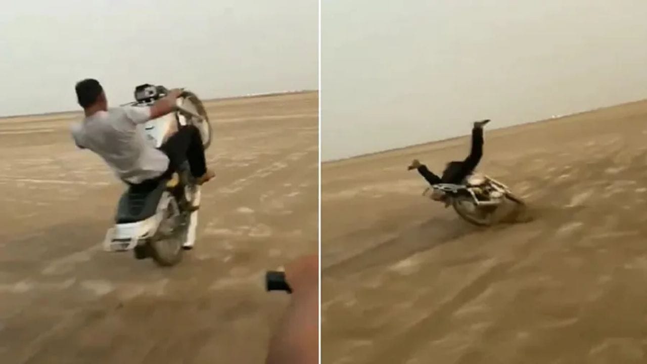 સોશિયલ મીડિયા પર તમે અવાર-નવાર આવા વીડિયો જોયા હશે. જેમાં લોકો અલગ-અલગ પ્રકારના સ્ટંટ અને ટ્રિક્સ કરતા જોવા મળે છે. કેટલીકવાર લોકો આરામથી સ્ટંટ કરે છે, પરંતુ ક્યારેક તેમના સ્ટંટ નિષ્ફળ (Stunt Fail) જાય છે અને તે પછી જે નજારો જોવા મળે છે તે આશ્ચર્યજનક છે. વાસ્તવમાં, કેટલાક લોકોને સ્ટંટ (Stunt) બતાવવાની પ્રક્રિયામાં ગંભીર ઇજાઓ પણ થાય છે. ખાસ કરીને જેઓ મોટરસાઇકલ સ્ટંટ (Motorcycle Stunt) કરે છે. તેઓએ ખૂબ કાળજી રાખવાની જરૂર છે, નહીંતર એકવાર સ્ટંટ ફેલ થઈ જાય તો ઈજા થવાની જ છે. આવા જ એક નિષ્ફળ સ્ટંટનો એક વીડિયો આજકાલ સોશિયલ મીડિયા પર ખૂબ જ વાયરલ થઈ (Viral Video) રહ્યો છે. જેને જોઈને તમે પણ આશ્ચર્યચકિત થઈ જશો અને હસતા જ રહી જશો.