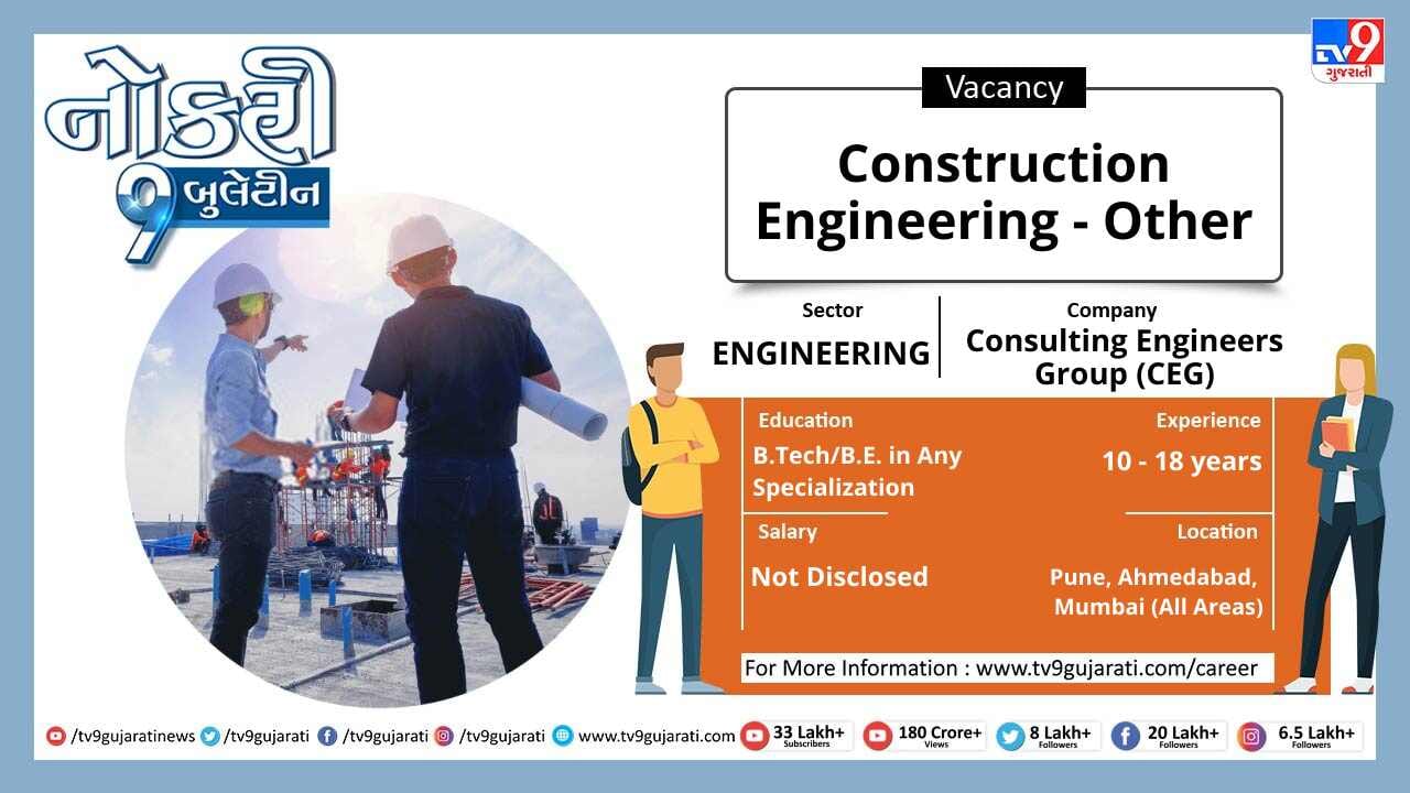 સ્નાતક થયેલા લોકો માટે નોકરીની ઉતમ તકો (Job Vacancy) સર્જાઈ છે, એન્જિનિયરિંગ ક્ષેત્રે નોકરી શોધી રહેલા ઉમેદવારો આ લીંક પર ક્લિક કરો અને મેળવો પોતાના ક્ષેત્ર વિશેની નોકરીની વિગતો સાથે પગાર, લાયકાત અને ધારાધોરણ.