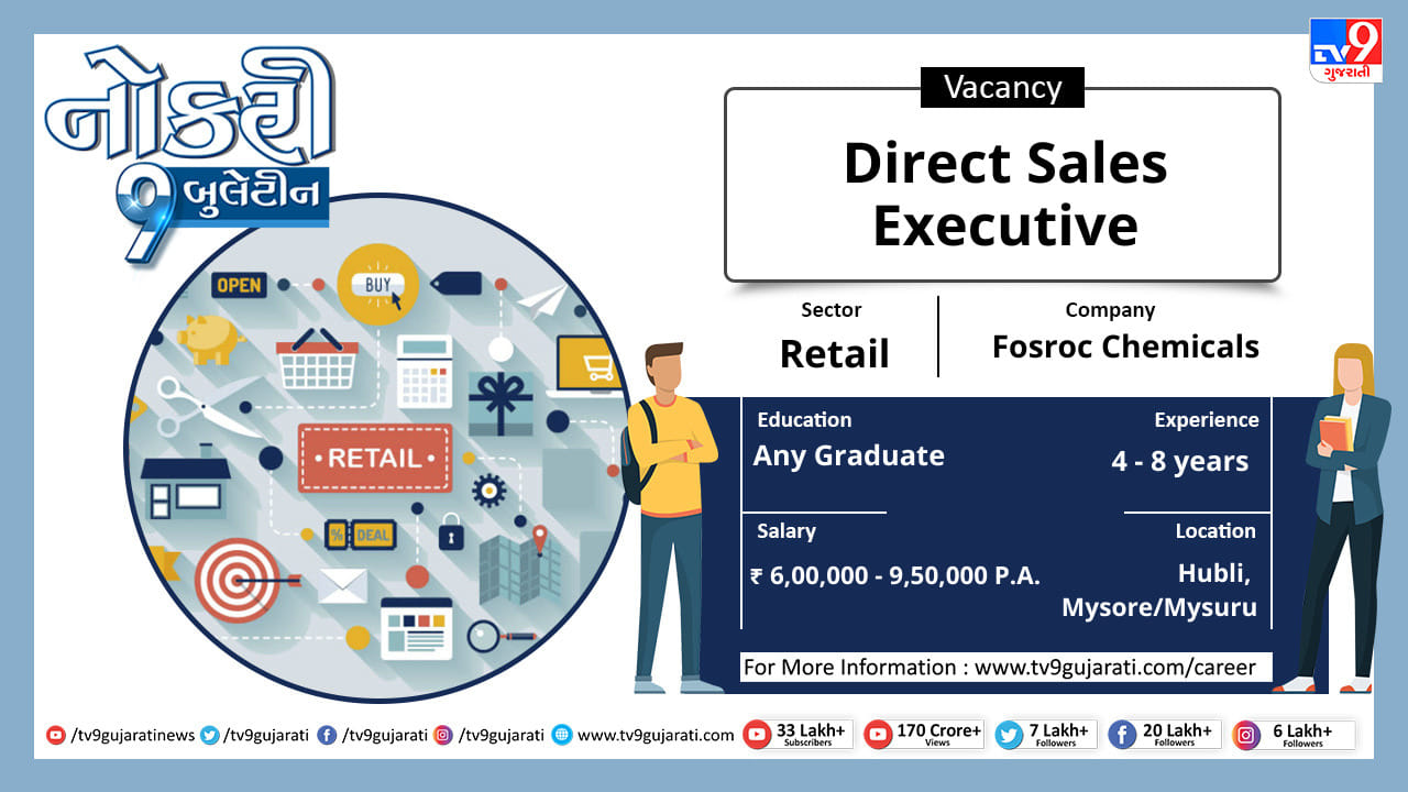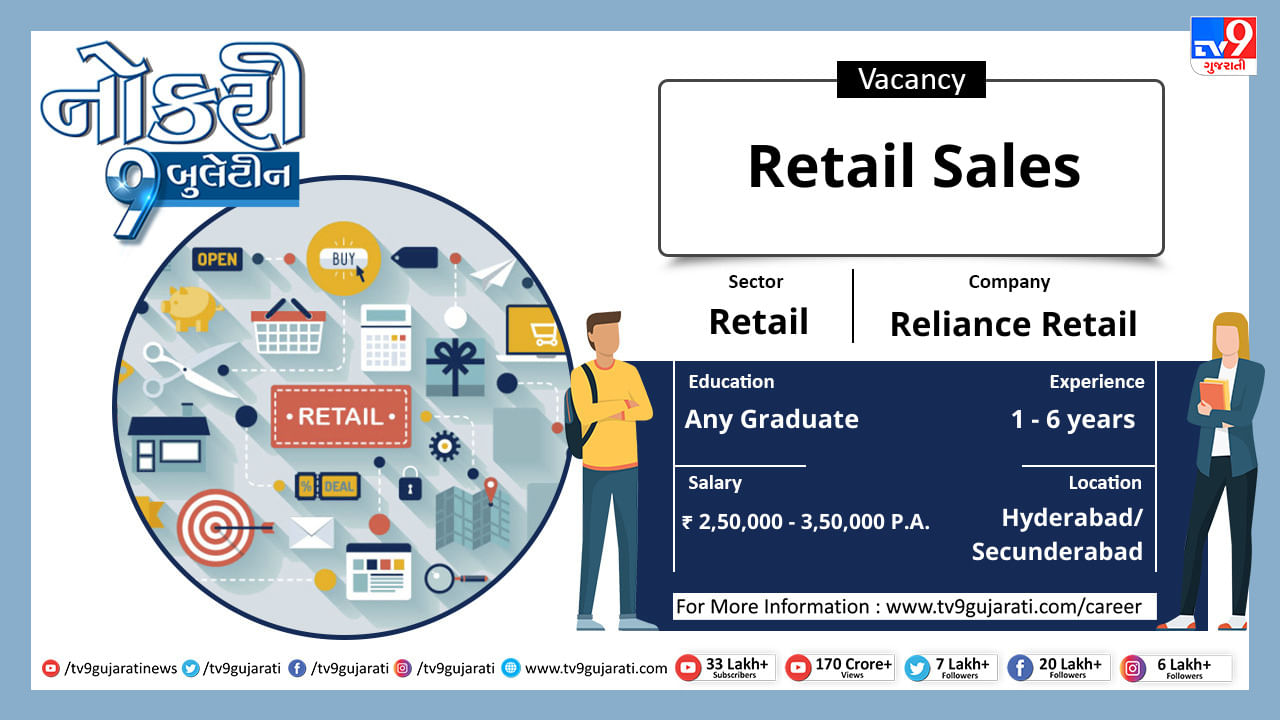 સ્નાતક થયેલા લોકો માટે નોકરીની ઉતમ તકો સર્જાઈ છે, રીટેલ ક્ષેત્રે નોકરી શોધી રહેલા ઉમેદવારો આ લીંક પર ક્લિક કરો અને મેળવો પોતાના ક્ષેત્ર વિશેની નોકરીની વિગતો સાથે પગાર, લાયકાત અને ધારાધોરણ.